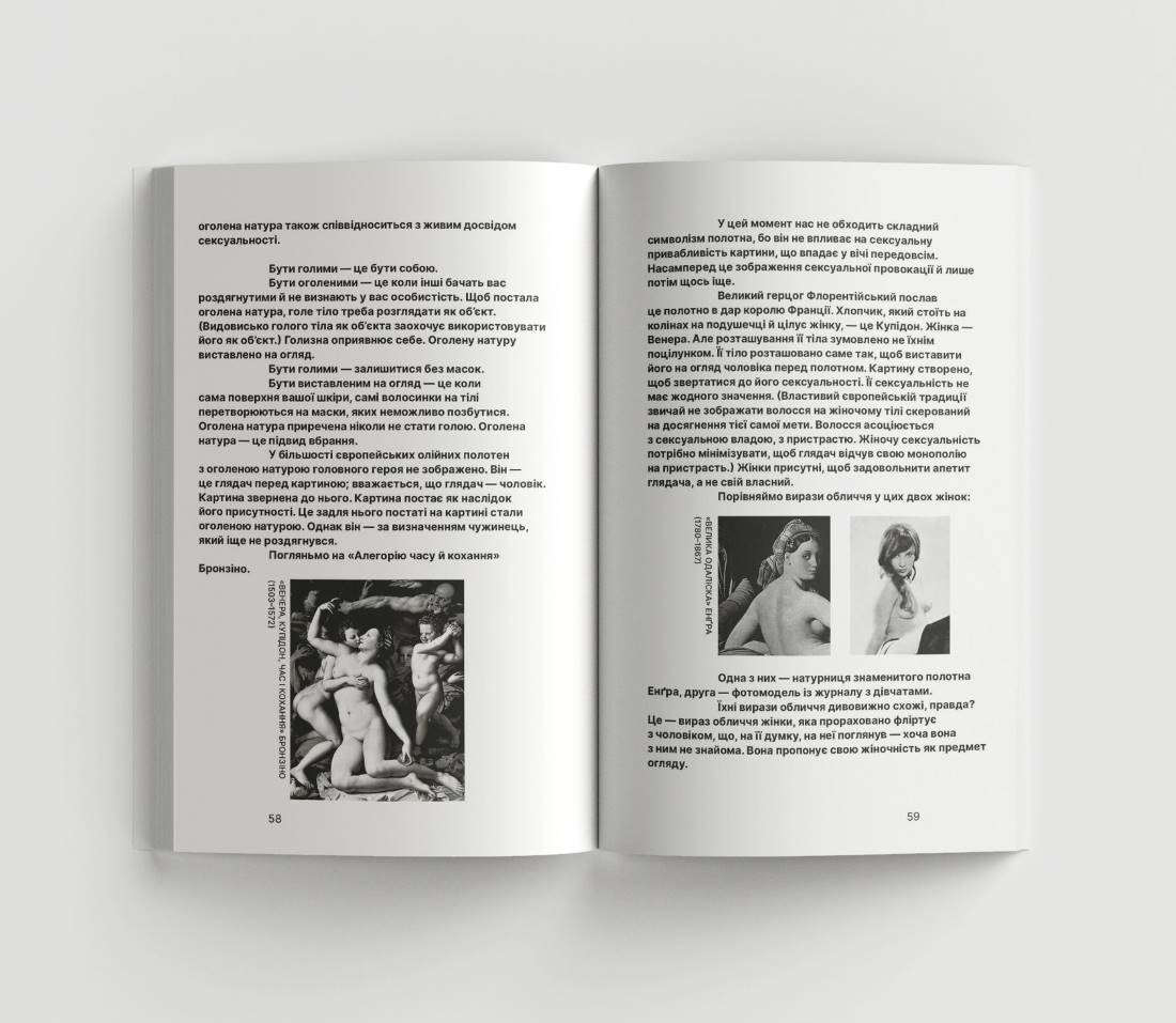 The art critic proposes a thesis that art texts should not only be authoritative statements about art, but also contribute to the ability of readers to see and express themselves. The structure of the book reproduces this tendency in the alternation of text and visual essays (which consist only of images). The reader looks at the image, and then reads the text. Reads and then independently examines the image. The book's purpose is to recreate this drive in the author's attempt to "begin to ask questions." It was important to Berger to create a book in which discussions of issues about art and technical reproduction, the female body, advertising, and oil painting would be taken up by readers and further discussed by a wide range of people: students, artists, art institutions, and other art historians.