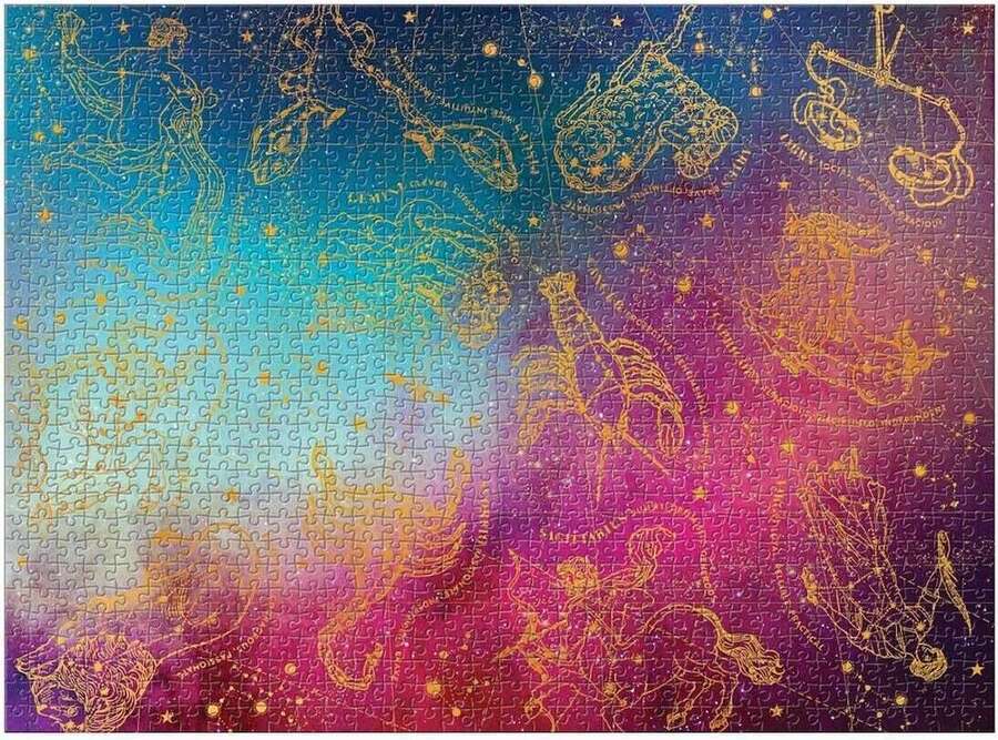 The twelve signs of the zodiac take on cosmic sparkle and shimmer on this gold foil embellished puzzle.