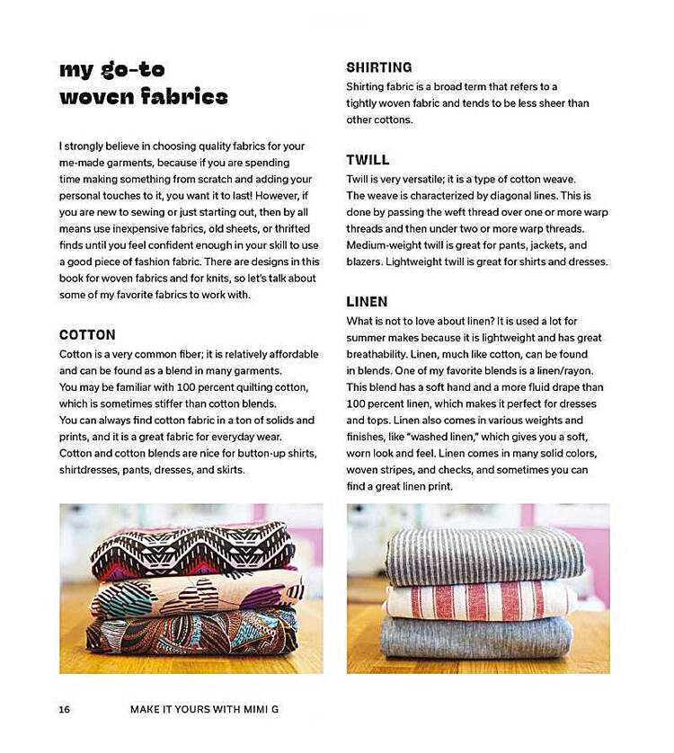 Make It Yours with Mimi G is all about creating a fully functional wardrobe to love. Starting with six base patterns, Mimi G then hacks each pattern to create 26 new designs that will be styled both together and separately for a total of more than 100 looks. But this book isnāt just about hacking patterns to give you a complete wardrobe; itās also about showing you how to style each garment and make your DIY wardrobe work for you.