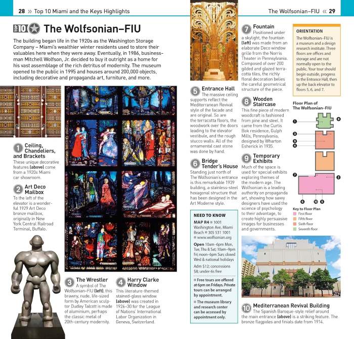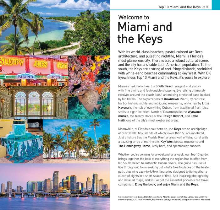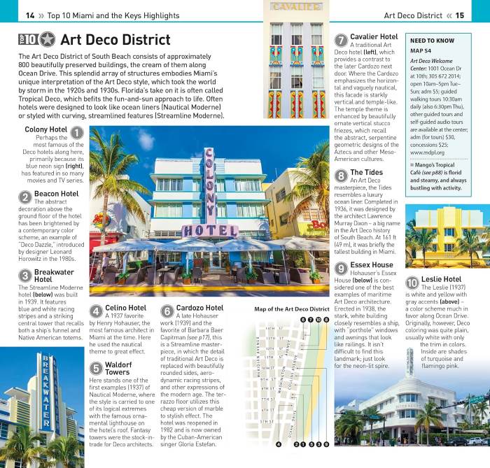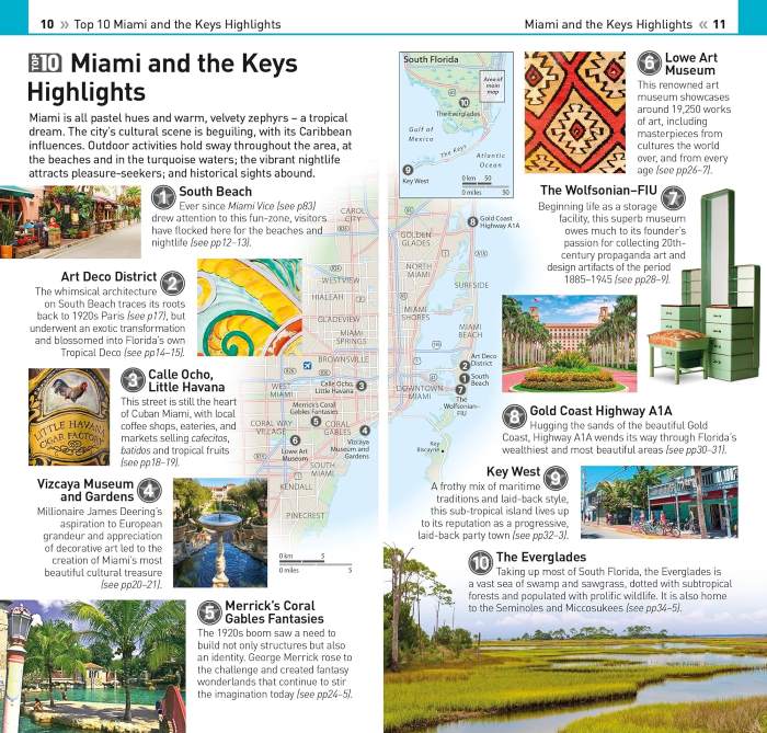 - Top 10 lists of must-sees , including South Beach, Little Havana, the Art Deco District and Key West Miami and the Keys’ most interesting areas, with the best places for sightseeing, food and drink, and shopping.